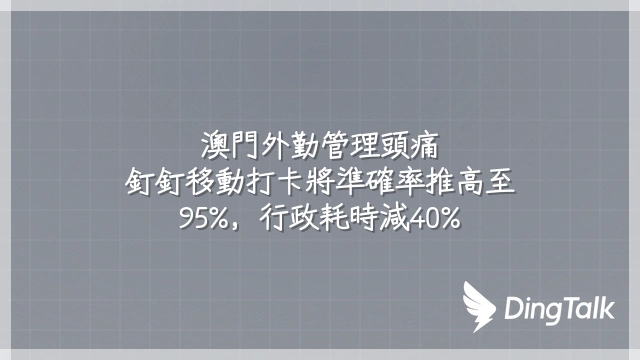 澳門外勤管理成日搞到頭痛?釘釘移動打卡用GPS、Wi-Fi同智能審批流,將打卡準確率推高至95%以上,行政耗時減40%。即刻睇點樣由「懷疑式稽核」轉為「即時支援」。