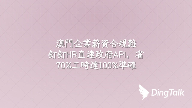 在監管日益嚴格的澳門,人工處理薪資已成風險源頭。釘釘HR透過API直連政府平台,實現薪酬計算與申報即時同步,節省70%工時、達成接近100%合規率,重塑人力資源價值。